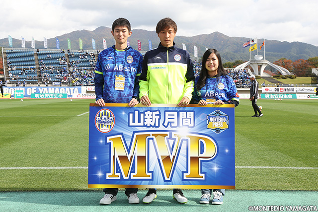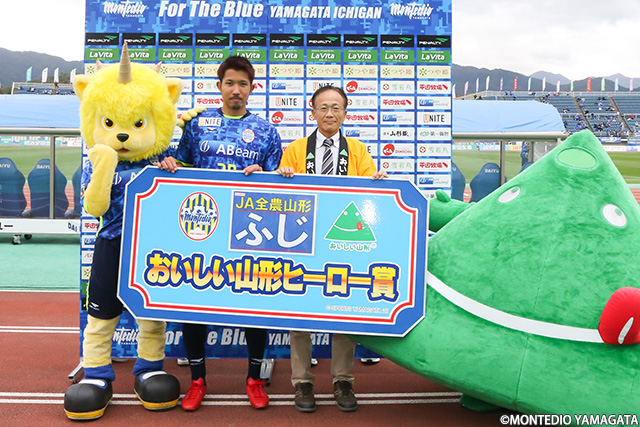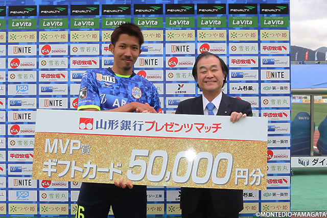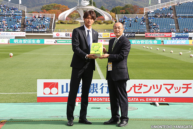 ピッチ内ウォーミングアップ前、9月の山形新聞月間MVP賞の表彰が行われました。選ばれたのは8月に移籍加入すると9月の全4試合に出場し1ゴール。攻撃を牽引した山岸祐也選手です。