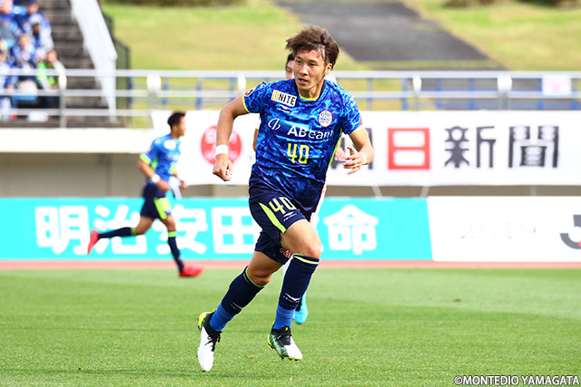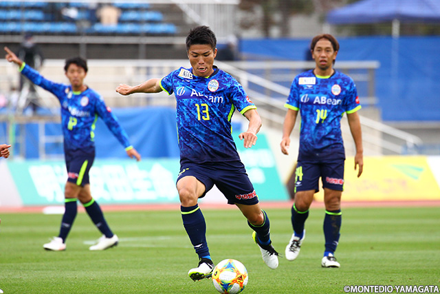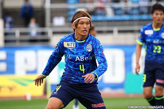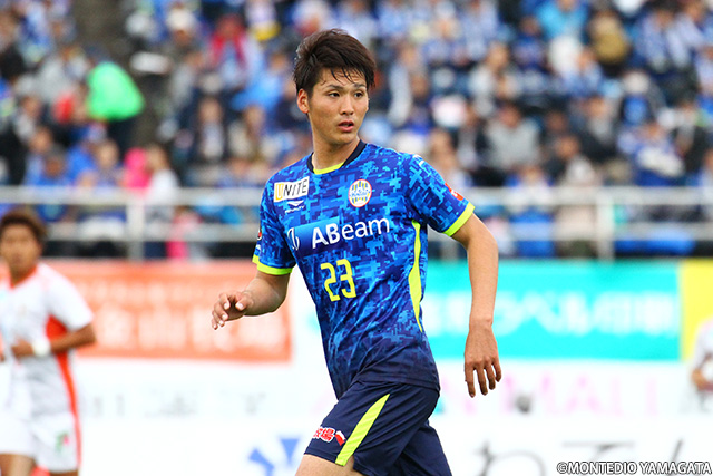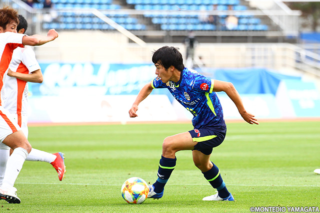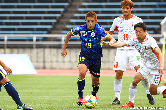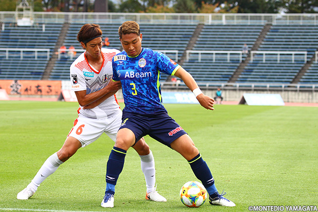 選手たちの積極性は守備でも発揮されます。一昨年モンテディオ山形に在籍した長沼洋一選手とマッチアップした山田拓巳選手も積極手にボールを奪いにいきます。