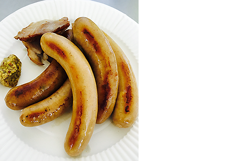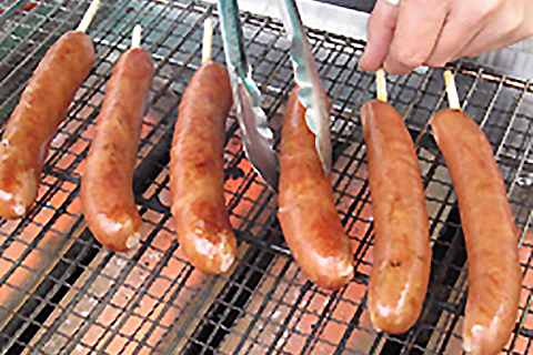 自社産ダチョウ肉と県産豚で手作りしたドイツ風フランクフルト。