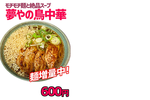 モチモチ麺と絶品スープ、麺増量中!夢やの人気商品です!