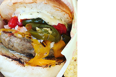 肉厚でジューシーなパティにスパイシーなチリソースが食欲をそそる贅沢バーガー!グルメテーリング限定でパティをダブルでも同価格で提供します!