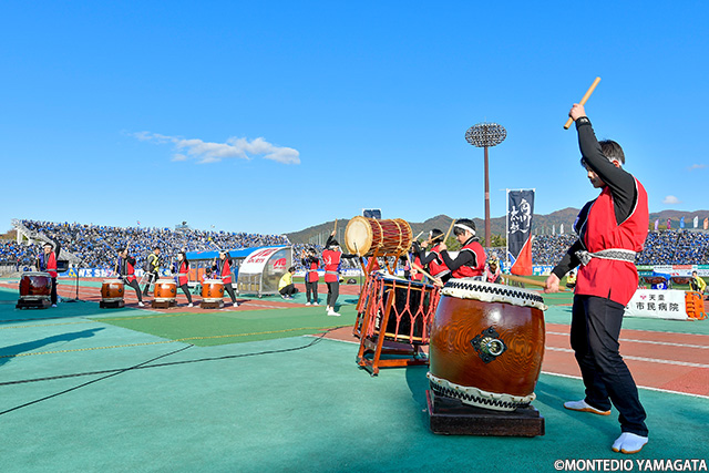 選手入場前、晴天のもと戸沢村・角川太鼓の皆さんによる和太鼓が打ち鳴らされ、スタジアムの雰囲気を大いに高めて頂きます。