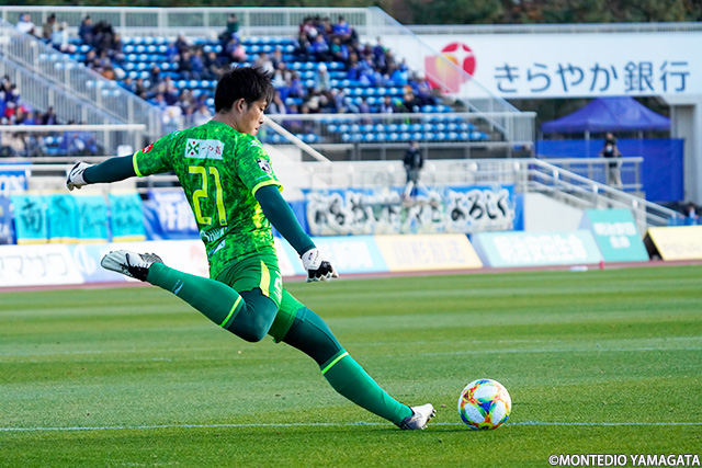 ゴールキックを蹴る櫛引政敏選手。距離の出る櫛引選手のキックも攻撃の起点となります。