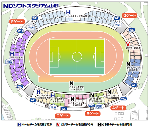 - 「ホーム自由席」、「バックスタンド自由席」、「メインスタンドS北指定席」、「メインスタンドSA北自由席」はモンテディオ山形の応援席です。対戦(ビジター)チームの「応援」及び「応援グッズの着用、使用」はできません。