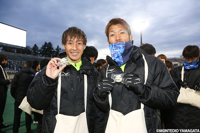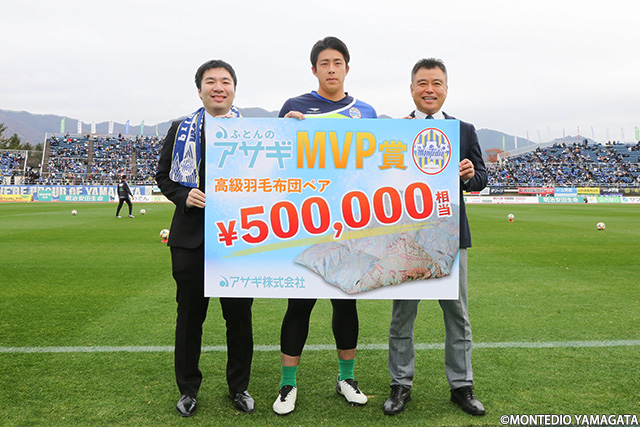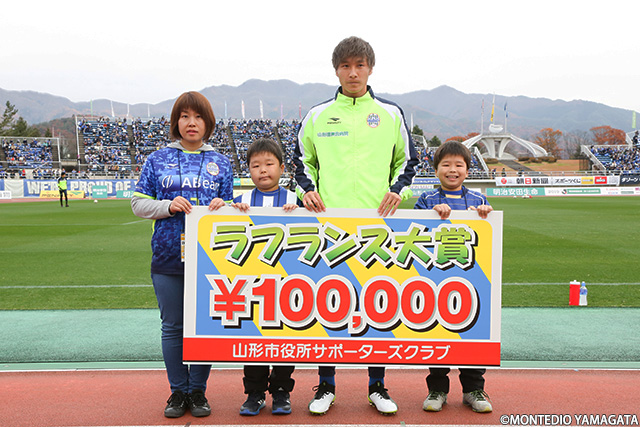 山形市役所サポーターズクラブ会員の投票により選出される今シーズン後期の最優秀選手 ラ・フランス大賞には、8月に加入すると攻撃面で大きな貢献を見せ、また41節山口戦ではチーム5年ぶりのハットトリックも達成した山岸祐也選手が選ばれました。