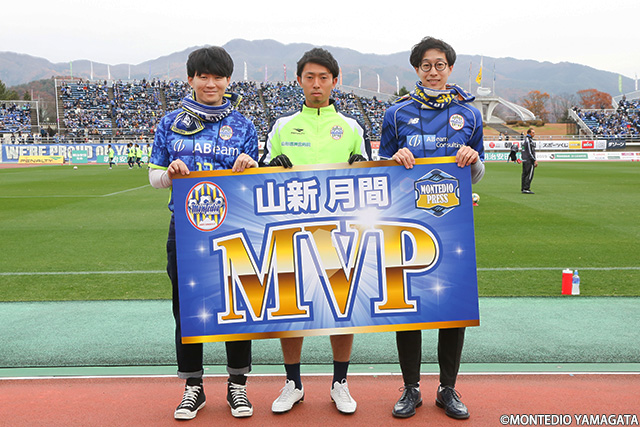 11月の山形新聞月間MVP賞には攻守に渡りチームを支え、ピッチ上で欠くことの出来ない存在感を見せた中村駿選手が選ばれ表彰されます。