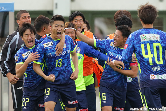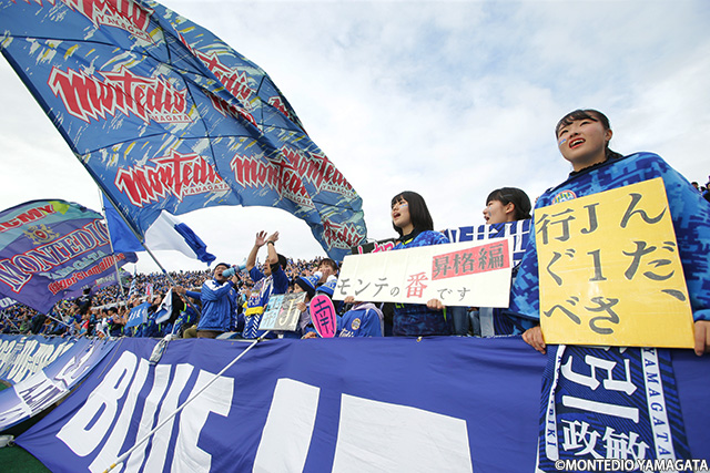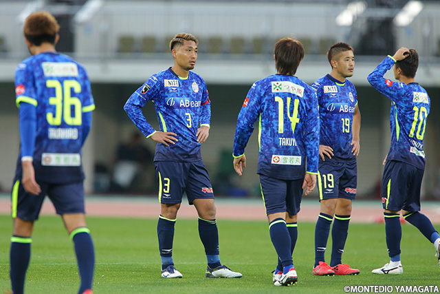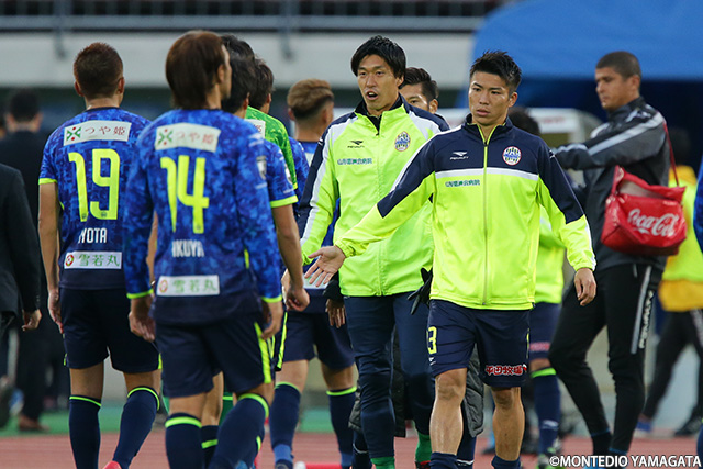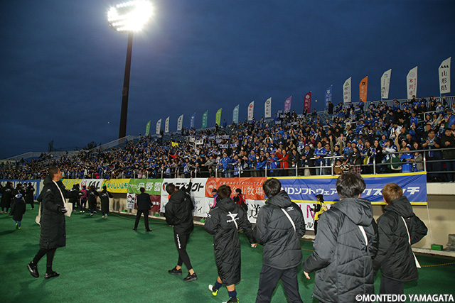 プレーオフに向けて勢いをつけるという意味でも、またホーム最終戦ということでも何としても勝ちたい試合だっただけに、選手たちの表情にも厳しいものが見えます。しかしこれでJ1昇格に向けての戦いは3連勝するだけとシンプルになりました。J1に向けてもう一度山形一丸で戦い抜きましょう!