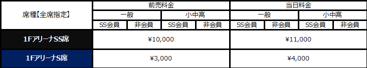 1FアリーナS席(一般・小中高) 3,000円 - 当日券:
