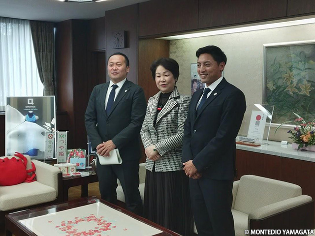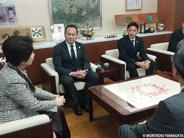 去る2019年12月27日山形県庁にシーズン終了の報告に弊社社長相田健太郎とキャプテン山田拓巳選手が訪問いたしました。