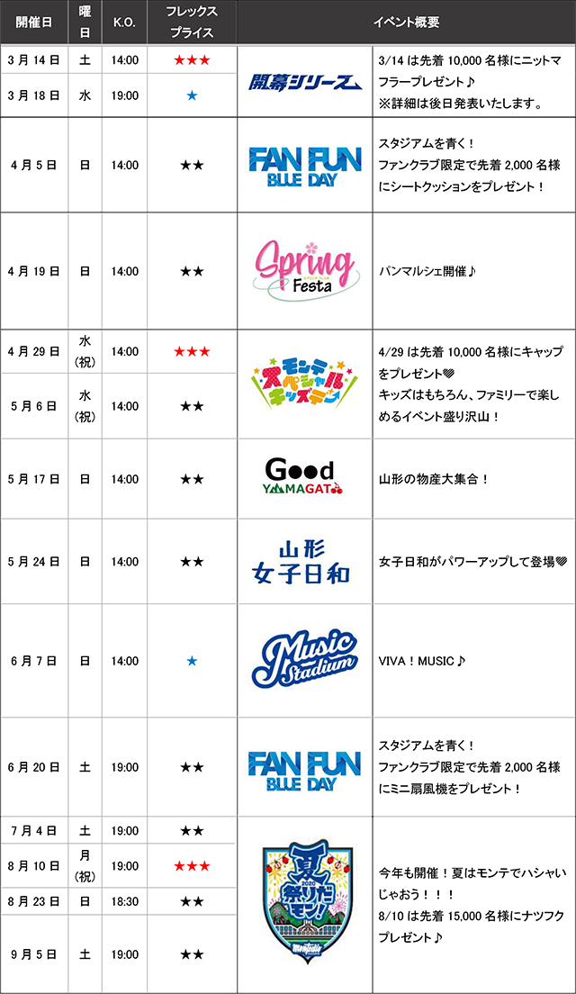 モンテディオ山形の9月5日までのホームゲームイベントが決定しましたので、皆さまにお知らせします。