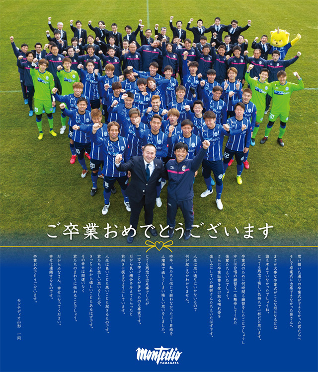 2020年3月18日(水)の山形新聞朝刊に新型コロナウィルスの影響で卒業式など中止や縮小など強いられている子どもたちや親御様、また現在暗くなっている世の中に少しでも元気になってもらうべくモンテディオ山形ができる事を考え、「卒業おめでとう」広告を展開いたしました。