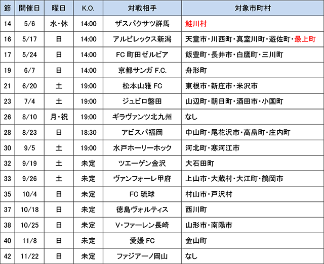 リーグ戦ホームゲームで行われる「市町村応援デー」について、リーグ戦の試合延期により、最上町・鮭川村応援デーの対象試合が下記の通り変更となります。