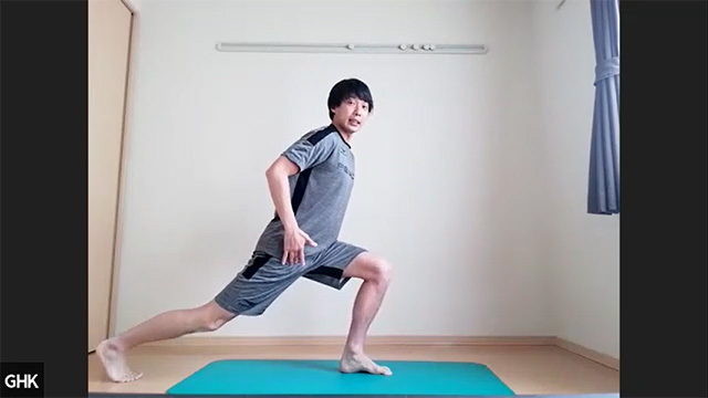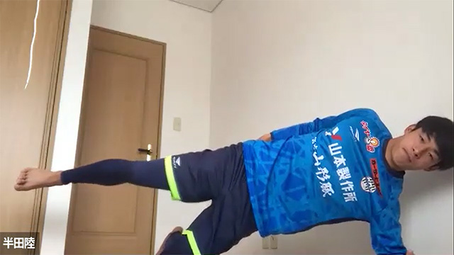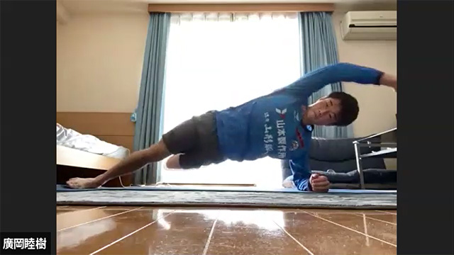 京谷トレーナーの指導の元、実際に選手が自宅で行っている体幹トレーニングをひとつひとつ分かりやすくかみ砕きながら説明し、半田選手・廣岡選手も生徒達の見本となる綺麗なフォームで一緒に汗を流しました。