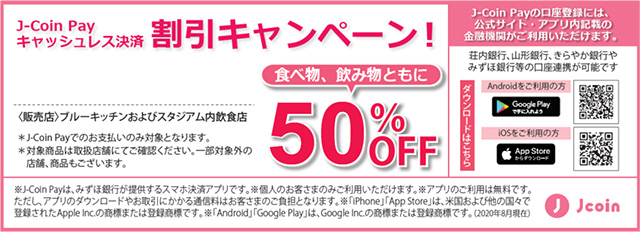 2020年9月19日(土)開催の北九州戦にて、スマホ決済アプリ「J-Coin Pay」を使ったキャッシュレス決済のご利用で、ブルーキッチンおよびスタジアム内飲食店の飲食物が50%OFFの割引キャンペーンを実施します。