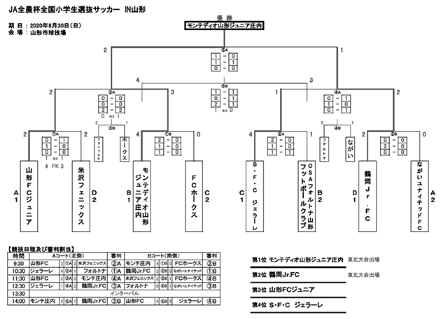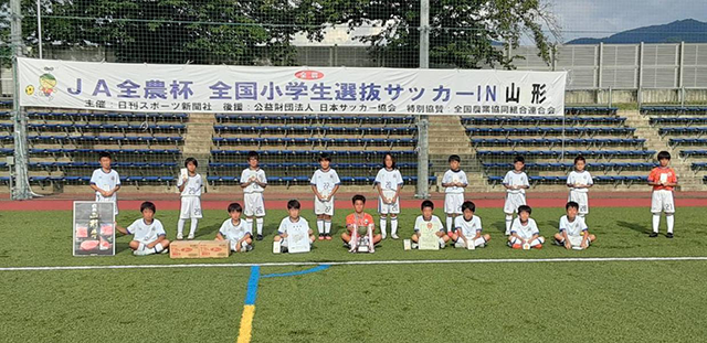 公開日 2020.08.31 JA全農杯全国小学生選抜サッカー IN山形 モンテディオ山形ジュニア庄内優勝 2020年8月29日・30日に行われたJA全農杯全国小学生選抜サッカー IN山形において、モンテディオ山形ジュニア庄内が優勝し、2021年3月開催予定の東北大会への出場が決定しましたのでお知らせします。 決勝トーナメント結果 (画像のクリックで大きいサイズでご覧いただけます) #アカデミー ニュース一覧