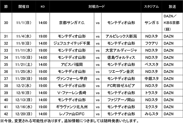 公開日 2020.10.02 リーグ戦11月・12月スケジュール決定について 2020シーズン11月・12月のリーグ戦試合日程が決定いたしましたので、下記の通りお知らせします。 2020明治安田生命J2リーグ モンテディオ山形試合スケジュール #チーム ニュース一覧