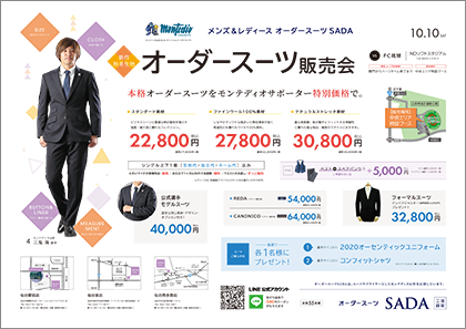 モンテディオ山形オフィシャルスーツはもちろん、他オーダースーツのお仕立ても大変お買い得な価格となっています。是非この機会にお求めいただき、選手と同じ素材、デザインのスーツの着心地をご体感下さい。