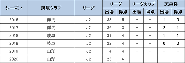 所属歴:柏ラッセル-尚志高-流通経済大-ザスパクサツ群馬-FC岐阜-モンテディオ山形