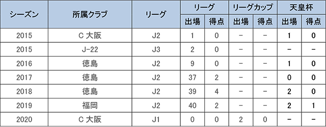 所属歴:摂津ベアーズ-高槻myd-セレッソ大阪U-18-セレッソ大阪-徳島ヴォルティス-アビスパ福岡-セレッソ大阪