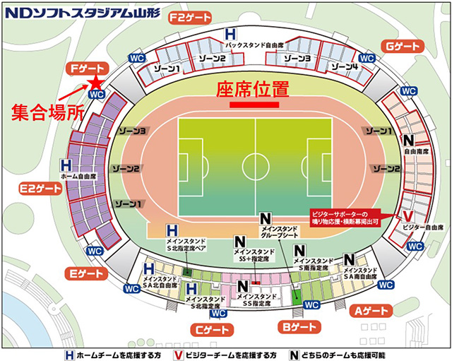 座席位置、入場方法について:ご入場はFゲートからとなります。試合開始1時間前の13時までにFゲート前にお集まりください。『ピッチサイドシート出入口』の看板が目印、スタッフが待機しています。