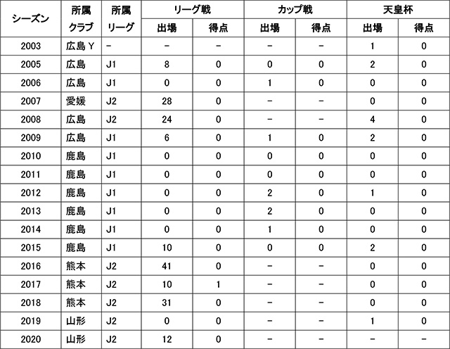 所属歴:朝日SSS-朝日中-サンフレッチェ広島ユース-サンフレッチェ広島-愛媛FC-サンフレッチェ広島-鹿島アントラーズ-サンフレッチェ広島-鹿島アントラーズ-