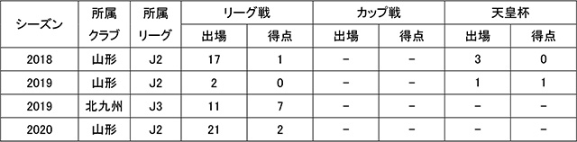 経歴:名古屋グランパスU-15-名古屋グランパスU-18-筑波大-モンテディオ山形-ギラヴァンツ北九州-モンテディオ山形