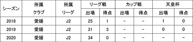 所属歴:大宮KSユナイテッド02サッカースポーツ少年団-大宮アルディージャジュニアユース-大宮アルディージャユース-明治大学-愛媛FC