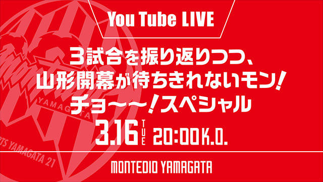 いよいよ3月21日(日)に山形開幕となる栃木SC戦に向け、【YouTubeライブ】3試合を振り返りつつ、山形開幕が待ちきれないモン!チョ〜〜!スペシャルをお届けします。