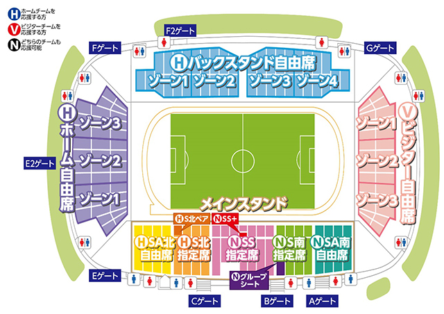 ※メインスタンドSS+指定席、SS指定席・S南指定席・グループシート・SA南自由席はニュートラルエリア(上記図「N」)です。ビジターチームを応援するお客様も、ビジターチームユニフォーム着用での観戦が可能です。