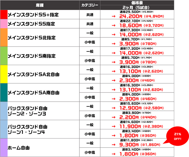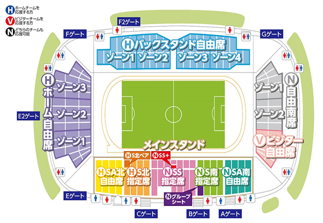 - メインスタンドS北指定席ペア・グループシート、自由南席、ビジター席の販売はありません。