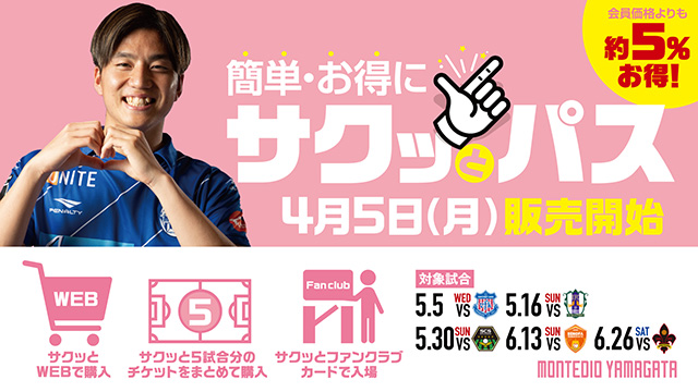 4月5日(日)より、ファンクラブ会員のお客様を対象に5月と6月開催のホームゲーム5試合の観戦チケットをサクッと簡単・お得に購入できるサクッとパスを販売します。