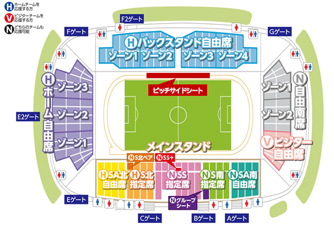※メインスタンドSS+指定席、SS指定席・S南指定席・グループシート・SA南自由席・自由南席がニュートラルエリア(上記図「N」)となり、ビジターチームを応援されるお客様も、ビジターチームユニフォーム着用での観戦が可能です。