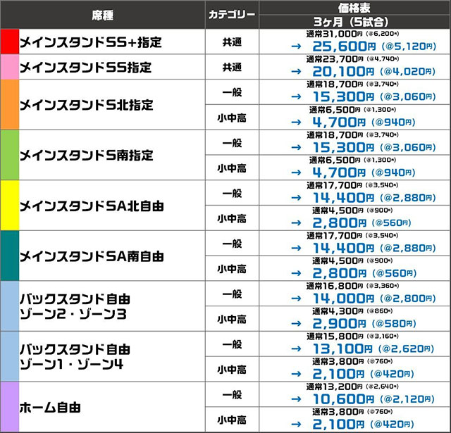 • メインスタンドS北指定席ペアシート、グループシート、ホーム自由南席、ビジター席の販売はございません。