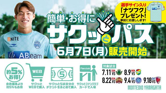 モンテディオ山形では6月7日(月)10時より、ファンクラブ会員のお客様を対象に7月・8月・9月のホームゲーム5試合の観戦チケット『サクッとパス』の販売を開始しました。