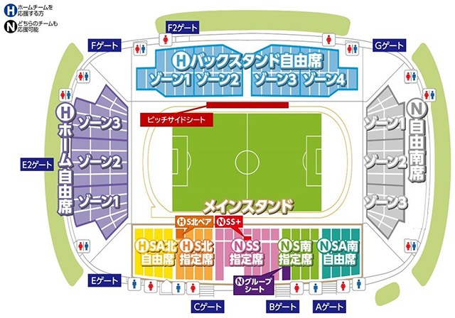 ※メインスタンドSS+指定席、SS指定席・S南指定席・グループシート・SA南自由席・自由南席がニュートラルエリア(上記図「N」)となり、ビジター自由席の設置はありません。