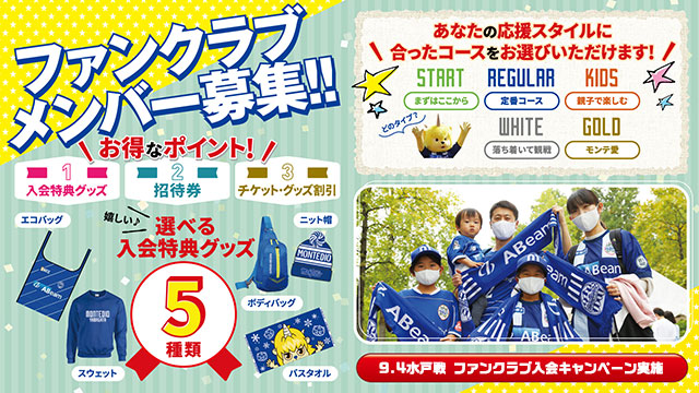 9月4日水戸ホーリーホック戦の試合会場にて、ファンクラブ入会キャンペーンを行います。事務手数料無しで入会できるお得なキャンペーンです。さらに、特典グッズをその場でお渡しします。