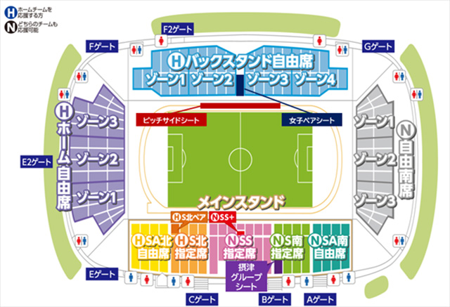 ※メインスタンドSS+指定席、SS指定席・S南指定席・グループシート・SA南自由席・自由南席がニュートラルエリア(上記図「N」)です。群馬県に緊急事態宣言が発出されるため、現時点でのビジター席の設置および販売はありません。