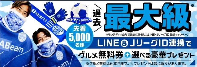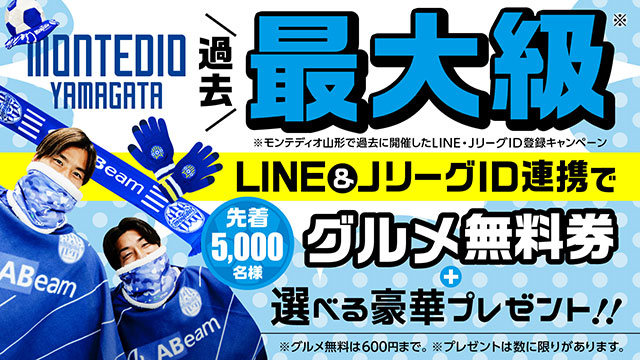 モンテディオ山形では、クラブ公式LINEとJリーグIDを連携を行ったお客様に12月5日(日)ギラヴァンツ北九州戦で使えるグルメ無料クーポン、ならびにこれまで来場者プレゼントとして配布したグッズの中から1個を合わせて先着5,000名様*にプレゼントします。
