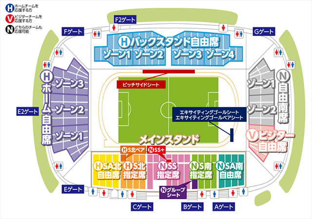 ※メインスタンドSS+指定席、SS指定席・S南指定席・グループシート・SA南自由席・自由南席がニュートラルエリア(上記図「N」)となり、ビジターチームを応援されるお客様も、ビジターチームユニフォーム着用での観戦が可能です。