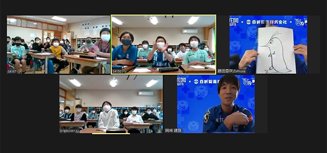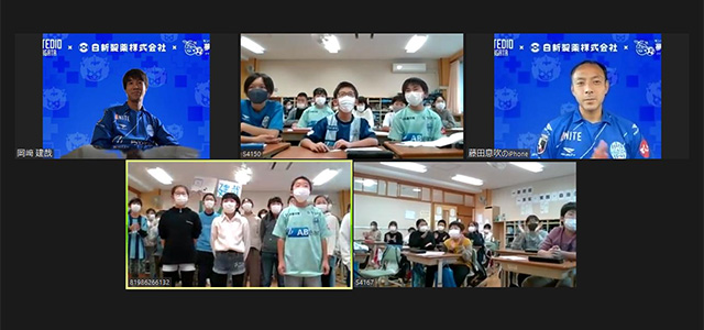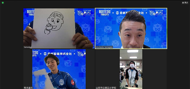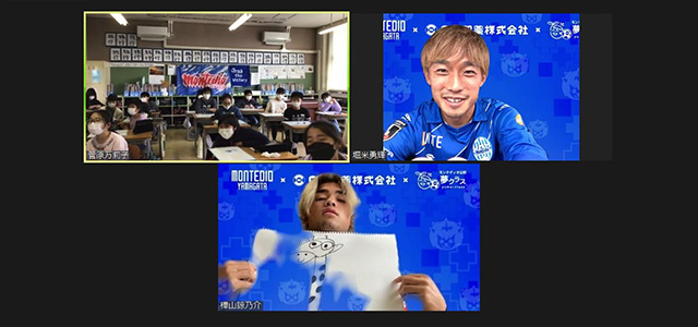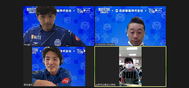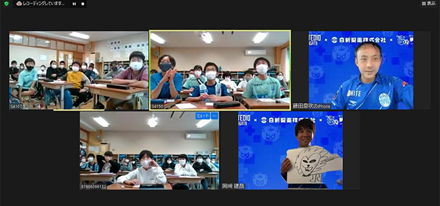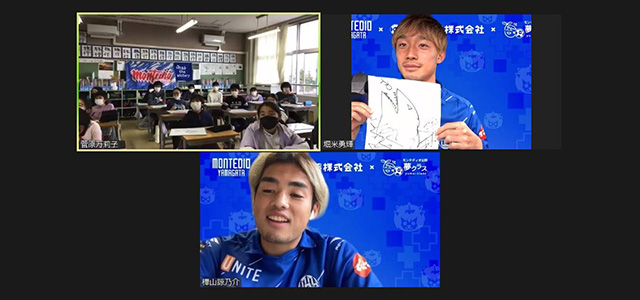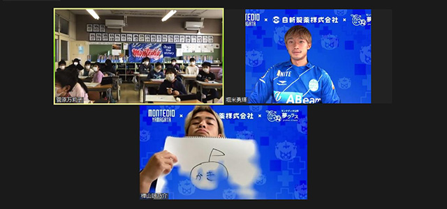 新型コロナウイルス感染症対策のため、オンラインで選手達が小学校の授業に参加する形式で行っています。