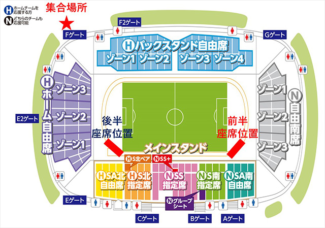 ご入場はFゲートからとなります。試合開始1時間前の12時までにFゲート前にお集まりください。『エキサイティングゴールシート』の看板が目印、スタッフが待機しています。