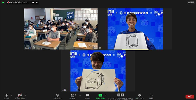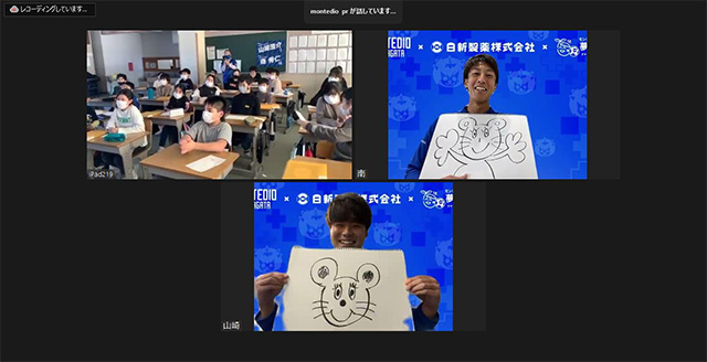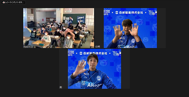 新型コロナウイルス感染症対策のため、オンラインで選手達が小学校の授業に参加する形式で行っています。