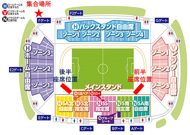 ご入場はFゲートからとなります。試合開始1時間前の13時までにFゲート前にお集まりください。『エキサイティングゴールシート』の看板が目印、スタッフが待機しています。