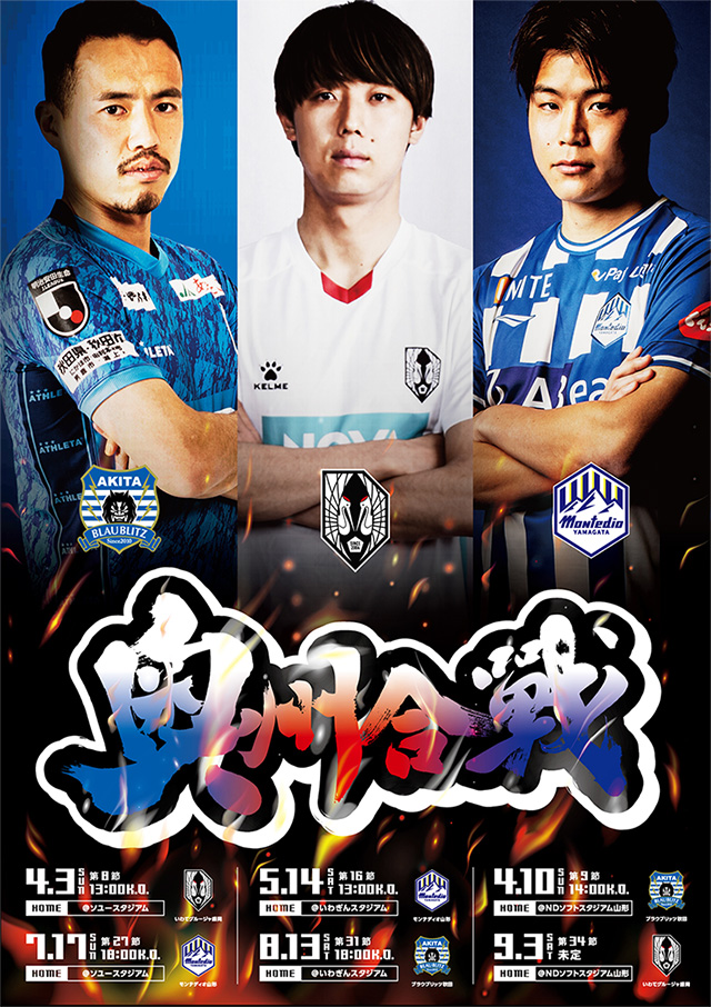 『奥州合戦』は4月3日の「ブラウブリッツ秋田vsいわてグルージャ盛岡」で開幕し、モンテディオ山形の初合戦は4月10日のホームゲーム ブラウブリッツ秋田戦です。