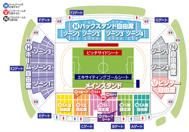 ※メインスタンドSS++指定席、SS+指定席・SS指定席・S南指定席・グループシート・SA南自由席・自由南席がニュートラルエリア(上記図「N」)となり、ビジターチームを応援されるお客様も、ビジターチームユニフォーム着用での観戦が可能です。