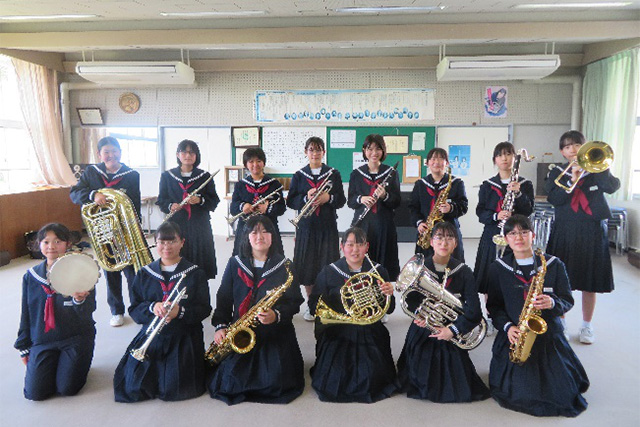 私たち朝日中学校吹奏楽部は14人で活動しています。試合での演奏は初めてなので、他校のみなさんと楽しく演奏、応援したいと思います。