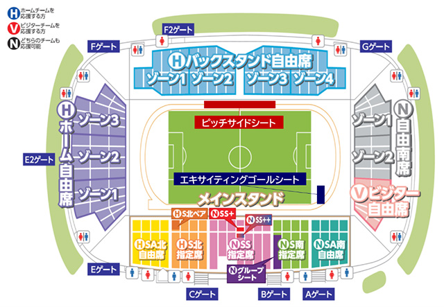 ※メインスタンドSS++指定席、SS+指定席・SS指定席・S南指定席・グループシート・SA南自由席・自由南席がニュートラルエリア(上記図「N」)となり、ビジターチームを応援されるお客様も、ビジターチームユニフォーム着用での観戦が可能です。