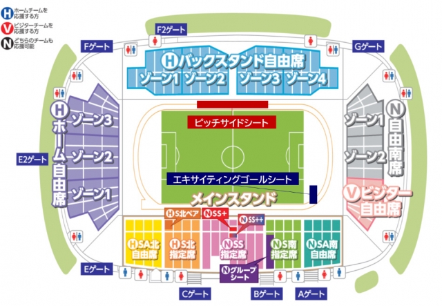 ※メインスタンドSS++指定席、SS+指定席・SS指定席・S南指定席・グループシート・SA南自由席・自由南席がニュートラルエリア(上記図「N」)となり、ビジターチームを応援されるお客様も、ビジターチームユニフォーム着用での観戦が可能です。