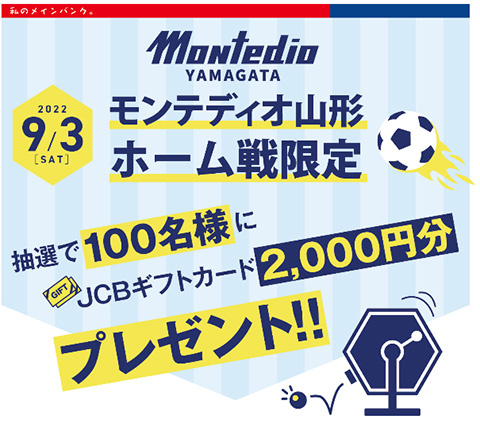 試合当日、チケット・グッズ・ブルーキッチンにて〈やまぎん〉デビットJCBを使って500円以上決済いただいたお客さま限定で、JCBギフトカード2,000円分が100名様に当たります。