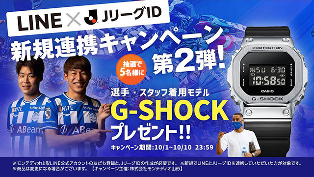 モンテディオ山形では先月続き「クラブ公式LINE×JリーグID新規連携キャンペーン第2弾」を実施します。新規で連携していただいたお客様に選手・スタッフ着用モデルのG-SHOCKを抽選で5名様にプレゼント!JリーグIDとクラブ公式LINEを連携することで、お客様だけの限定情報やプレゼント情報を受信出来るようになります。
